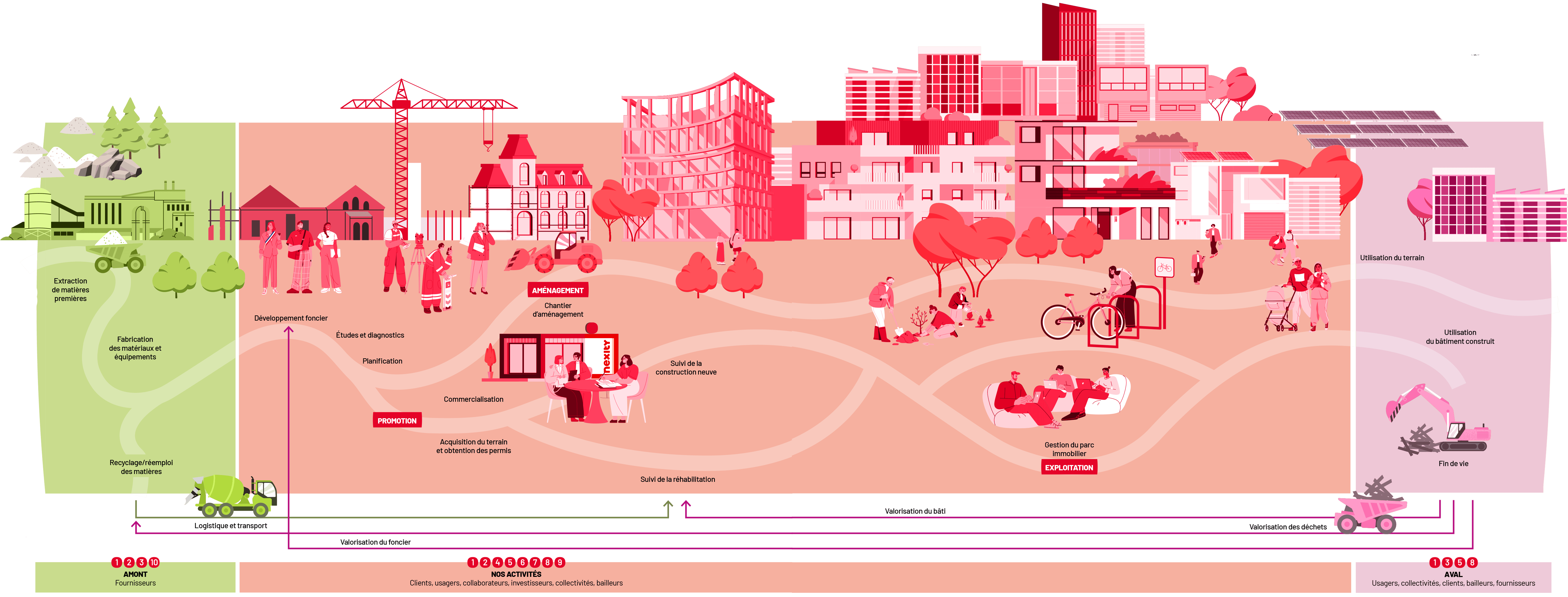 Le schéma ci-dessous illustre les processus, étapes clés et interactions principales impliqués dans la création de valeur ajoutée par Nexity. Il met en évidence nos parties prenantes ainsi que les enjeux concernés par nos activités dans le contexte plus large dans lequel l’entreprise opère, en amont et en aval de nos activités.